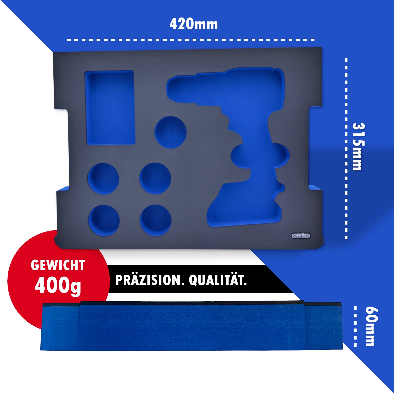 Die Schwäble Werkzeuge Schaumeinlagen bieten die ideale Lösung für die sichere und organisierte Aufbewahrung Ihrer Werkzeuge. Mit ihrer hohen Qualität und Funktionalität unterstützen sie Ihre Arbeit und tragen dazu bei, Ihre Werkzeuge optimal zu schützen und stets griffbereit zu halten. Die Schaumeinlagen sind Öl- Feuchtigkeitsresitent und wesentlich Dichter als je zuvor. Unsere eigene Rezeptur sorgt dafür, dass die Einlagen hoch verdichtet hergestellt werden, sodass sich dies im Gewicht von ca. 300g wiederspiegelt.