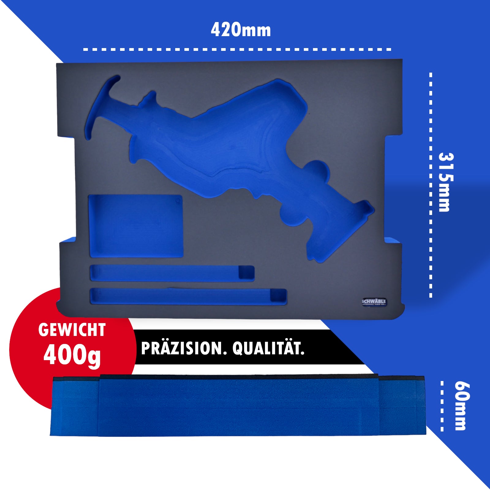Die Schwäble Werkzeuge Schaumeinlagen bieten die ideale Lösung für die sichere und organisierte Aufbewahrung Ihrer Werkzeuge. Mit ihrer hohen Qualität und Funktionalität unterstützen sie Ihre Arbeit und tragen dazu bei, Ihre Werkzeuge optimal zu schützen und stets griffbereit zu halten. Die Schaumeinlagen sind Öl- Feuchtigkeitsresitent und wesentlich Dichter als je zuvor. Unsere eigene Rezeptur sorgt dafür, dass die Einlagen hoch verdichtet hergestellt werden, sodass sich dies im Gewicht von ca. 300g wiederspiegelt.