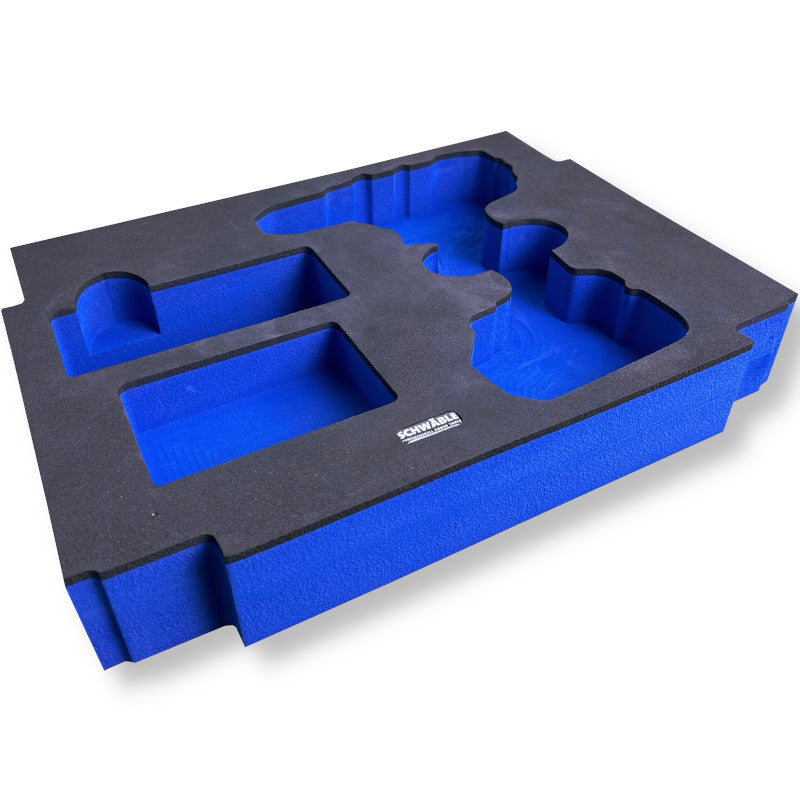 Wir verkaufen exklusiv die Original Schaumstoffeinlagen von SCHWÄBLE®. Der speziell entwickelte Schaumstoff wurde extra verdichtet und ist somit speziell geeignet als Einlagen für Werkzeuge. Der Polyethylen-Schaumstoff hat eine Stärke von 6cm inkl. einer laminierten 5mm Deckschicht. Die Einlagen wiegen im Schnitt ca. 300g. Die Oberfläche ist hitzebehandelt, sodass die Poren geschlossen sind. Daher ölresistent, langlebig. Weitere Einlagen für alle möglichen Hersteller&Varianten finden Sie auf unserer Webseite.
