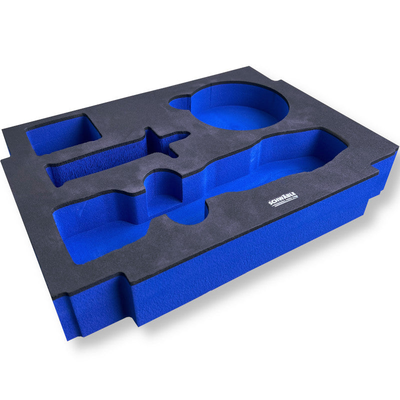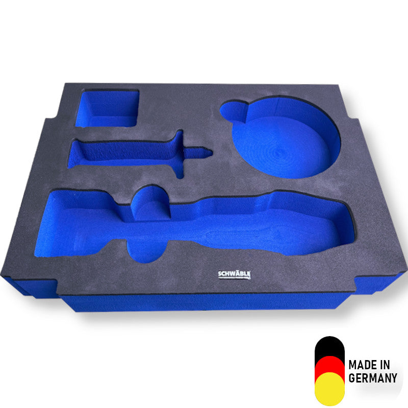 Wir verkaufen exklusiv die Original Schaumstoffeinlagen von SCHWÄBLE®. Der speziell entwickelte Schaumstoff wurde extra verdichtet und ist somit speziell geeignet als Einlagen für Werkzeuge. Der Polyethylen-Schaumstoff hat eine Stärke von 6cm inkl. einer laminierten 5mm Deckschicht. Die Einlagen wiegen im Schnitt ca. 300g. Die Oberfläche ist hitzebehandelt, sodass die Poren geschlossen sind. Daher ölresistent, langlebig. Weitere Einlagen für alle möglichen Hersteller&Varianten finden Sie auf unserer Webseite.
