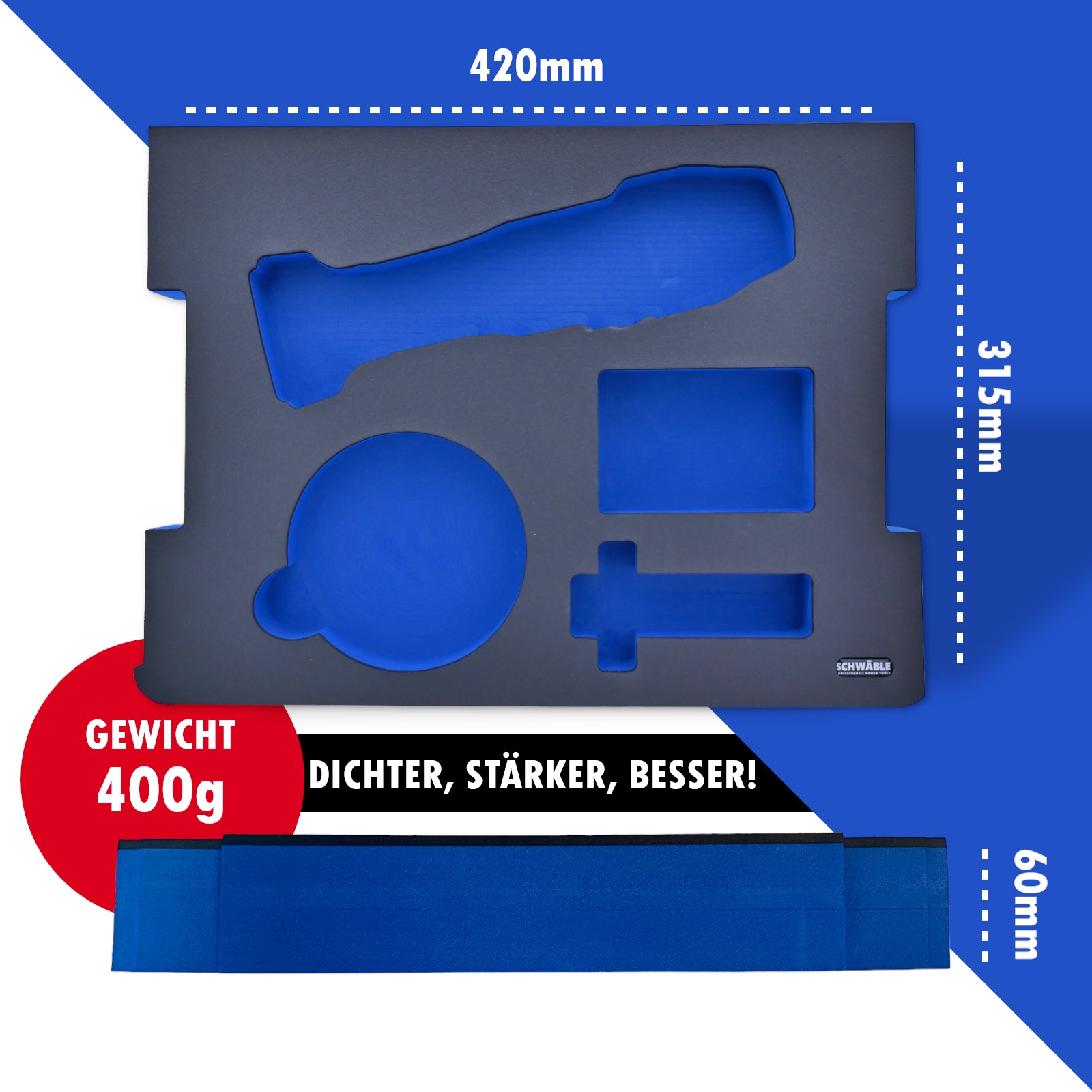 Die Schwäble Werkzeuge Schaumeinlagen bieten die ideale Lösung für die sichere und organisierte Aufbewahrung Ihrer Werkzeuge. Mit ihrer hohen Qualität und Funktionalität unterstützen sie Ihre Arbeit und tragen dazu bei, Ihre Werkzeuge optimal zu schützen und stets griffbereit zu halten. Die Schaumeinlagen sind Öl- Feuchtigkeitsresitent und wesentlich Dichter als je zuvor. Unsere eigene Rezeptur sorgt dafür, dass die Einlagen hoch verdichtet hergestellt werden, sodass sich dies im Gewicht von ca. 300g wiederspiegelt.