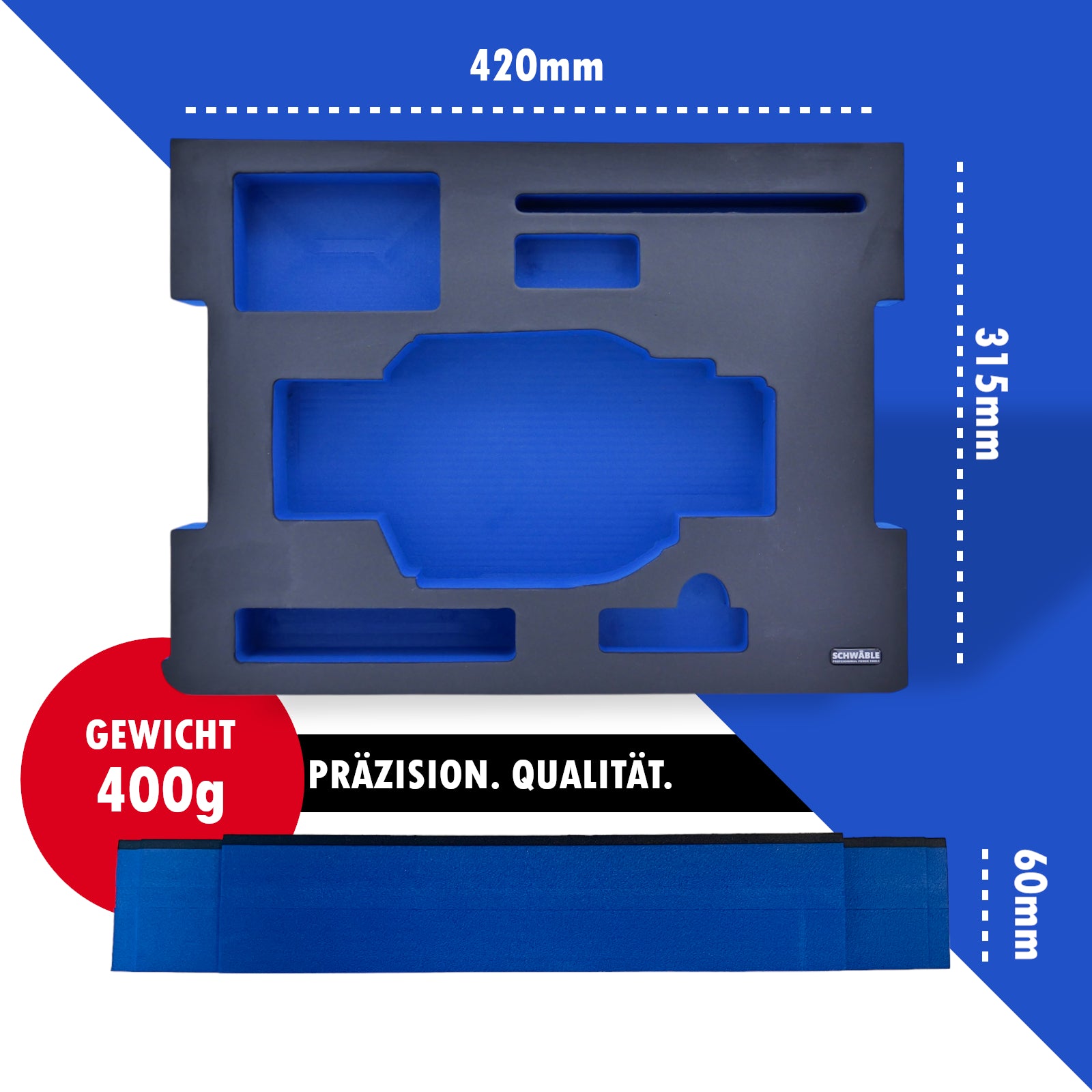 Die Schwäble Werkzeuge Schaumeinlagen bieten die ideale Lösung für die sichere und organisierte Aufbewahrung Ihrer Werkzeuge. Mit ihrer hohen Qualität und Funktionalität unterstützen sie Ihre Arbeit und tragen dazu bei, Ihre Werkzeuge optimal zu schützen und stets griffbereit zu halten. Die Schaumeinlagen sind Öl- Feuchtigkeitsresitent und wesentlich Dichter als je zuvor. Unsere eigene Rezeptur sorgt dafür, dass die Einlagen hoch verdichtet hergestellt werden, sodass sich dies im Gewicht von ca. 300g wiederspiegelt.