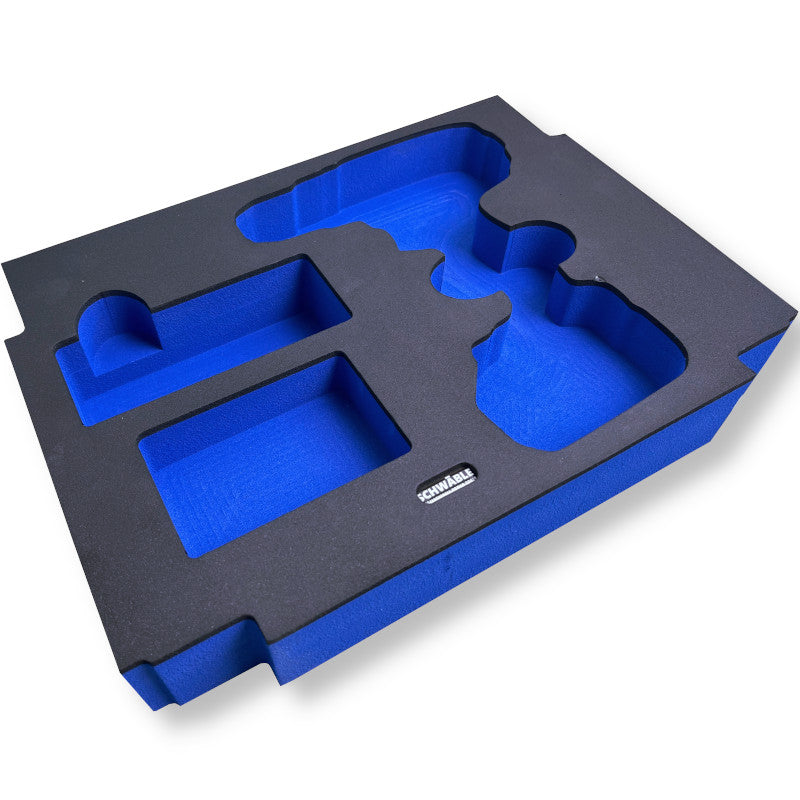 Wir verkaufen exklusiv die Original Schaumstoffeinlagen von SCHWÄBLE®. Der speziell entwickelte Schaumstoff wurde extra verdichtet und ist somit speziell geeignet als Einlagen für Werkzeuge. Der Polyethylen-Schaumstoff hat eine Stärke von 6cm inkl. einer laminierten 5mm Deckschicht. Die Einlagen wiegen im Schnitt ca. 300g. Die Oberfläche ist hitzebehandelt, sodass die Poren geschlossen sind. Daher ölresistent, langlebig. Weitere Einlagen für alle möglichen Hersteller&Varianten finden Sie auf unserer Webseite.
