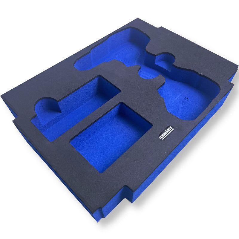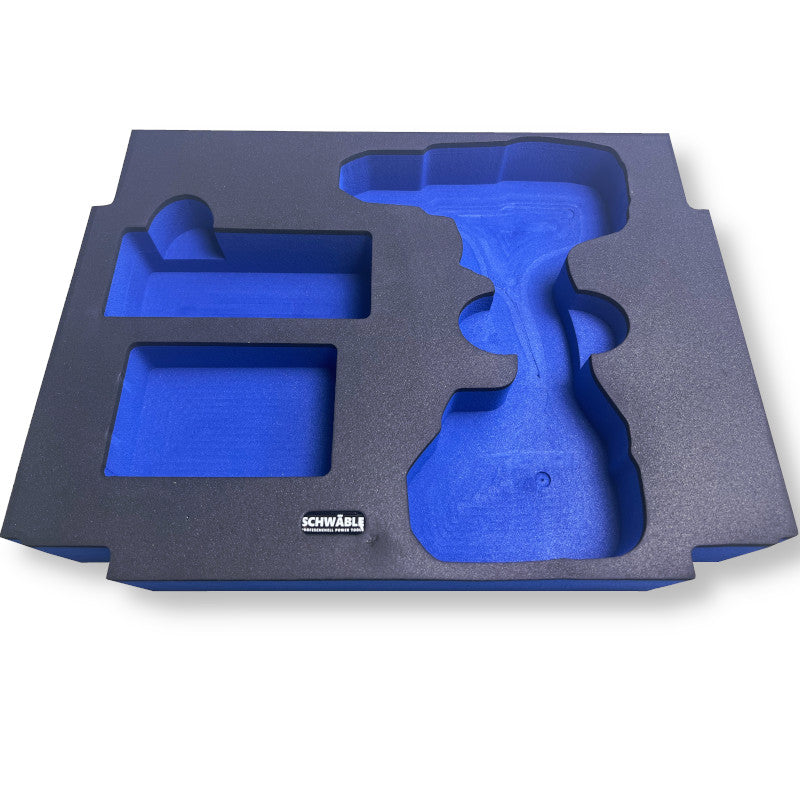 Wir verkaufen exklusiv die Original Schaumstoffeinlagen von SCHWÄBLE®. Der speziell entwickelte Schaumstoff wurde extra verdichtet und ist somit speziell geeignet als Einlagen für Werkzeuge. Der Polyethylen-Schaumstoff hat eine Stärke von 6cm inkl. einer laminierten 5mm Deckschicht. Die Einlagen wiegen im Schnitt ca. 300g. Die Oberfläche ist hitzebehandelt, sodass die Poren geschlossen sind. Daher ölresistent, langlebig. Weitere Einlagen für alle möglichen Hersteller&Varianten finden Sie auf unserer Webseite.