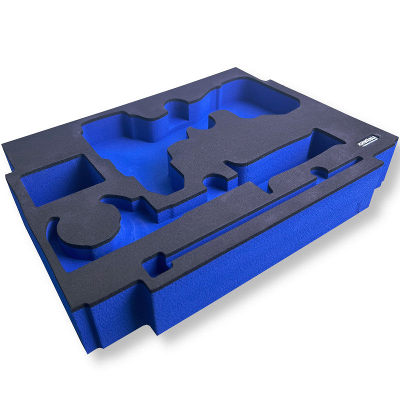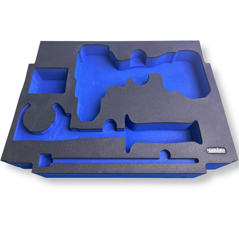 Wir verkaufen exklusiv die Original Schaumstoffeinlagen von SCHWÄBLE®. Der speziell entwickelte Schaumstoff wurde extra verdichtet und ist somit speziell geeignet als Einlagen für Werkzeuge. Der Polyethylen-Schaumstoff hat eine Stärke von 6cm inkl. einer laminierten 5mm Deckschicht. Die Einlagen wiegen im Schnitt ca. 300g. Die Oberfläche ist hitzebehandelt, sodass die Poren geschlossen sind. Daher ölresistent, langlebig. Weitere Einlagen für alle möglichen Hersteller&Varianten finden Sie auf unserer Webseite.
